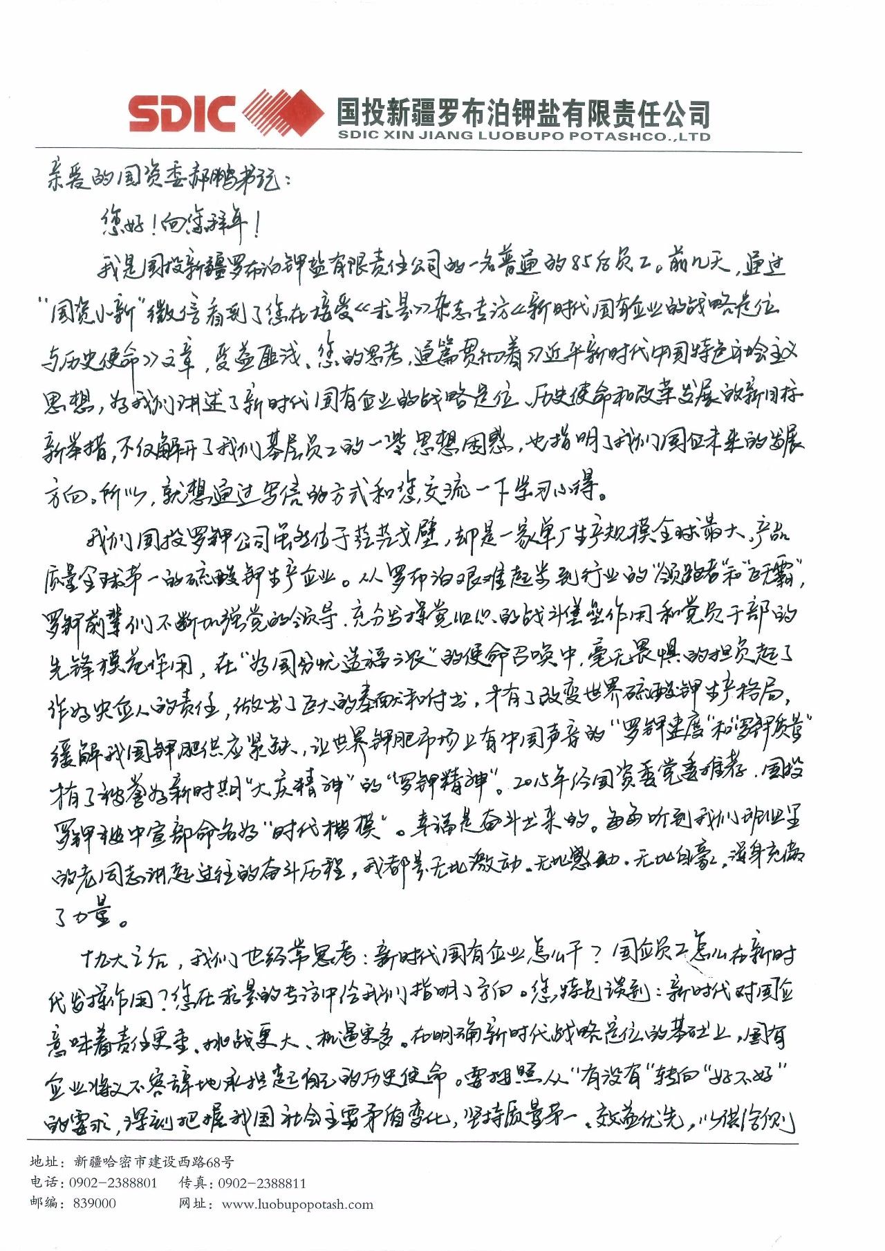 我是國投新疆羅布泊鉀鹽有限責任公司的一名普通的85后員工。前幾天,通過“國資小新”微信看到了您在接受《求是》雜志專訪的《新時代國有企業的戰略定位與歷史使命》文章,受益匪淺。您的思考,通篇貫徹著習近平新時代中國特色社會主義思想,為我們講述了新時代國有企業的戰略定位、歷史使命和改革發展的新目標新舉措,不僅解開了我們基層員工的一些思想困惑,也指明了我們國企未來的發展方向。所以,就想通過寫信的方式和您交流一下學習心得。