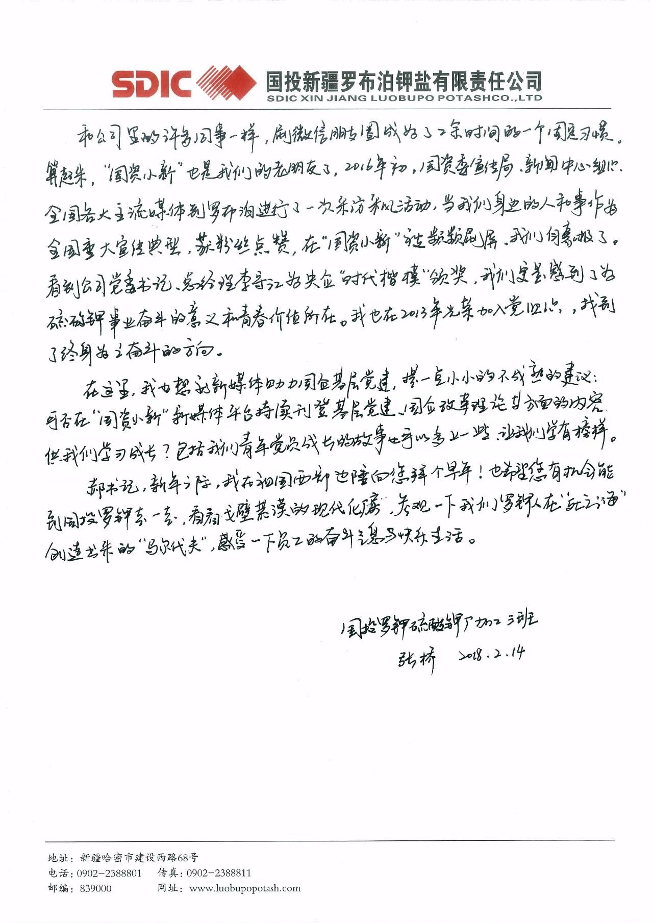這封寫給郝鵬書記的信,來自國投新疆羅布泊鉀鹽有限責任公司硫酸鉀廠加工車間加工三班的一位普通青年員工。